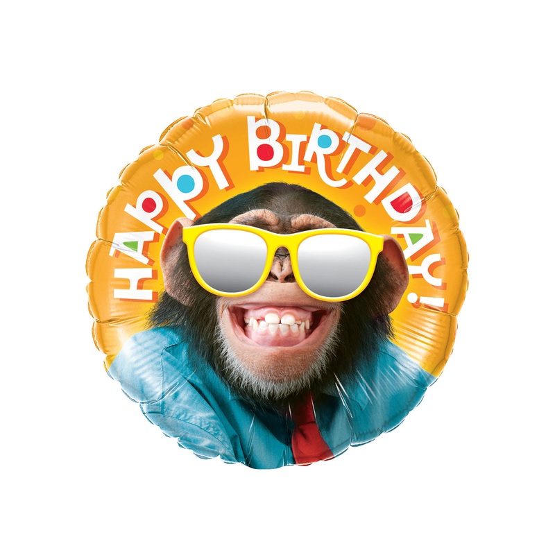 Smiling Chimp 17 inch round Happy Birthday foil balloon.Click & Collect orders: Balloon supplied inflated with helium.Delivery orders: Balloon supplied deflated.Balloon comes with a plastic weight or choose a foil weight here. We guarantee our foilballoons