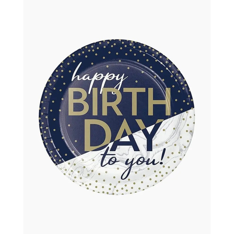 Introducing the Navy & Gold Milestone Happy Birthday 7" Plate, a sophisticated piece designed to elevate your celebrations. With its striking navy blue background complemented by luxurious gold lettering, this plate serves as an elegant addition to both de