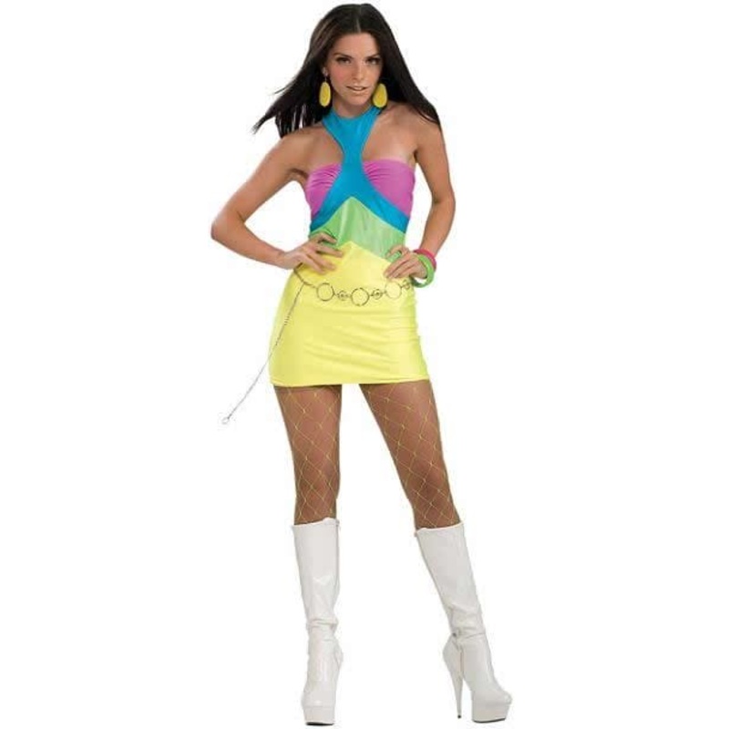 Neon Groove Adult Costume includes: Three color mini dress with crisscross front detailing and hippie style chain belt.