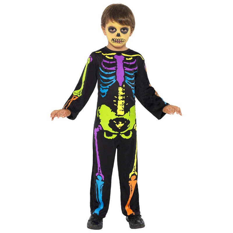 A skeleton costume with a difference! Printed all-in-one Halloween jumpsuit with neon colours.Add our skeleton make-up kit to get the pictured look.SizeAgeHeightToddler3-4 years100-113cmSmall4-6 years115-128cmMedium7-9 years130-143cmLarge10-12 years145-158