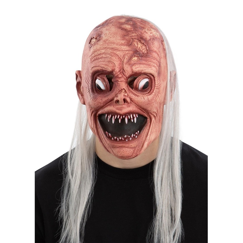 Halloween nightmare smile latex mask with long grey whispy hair.