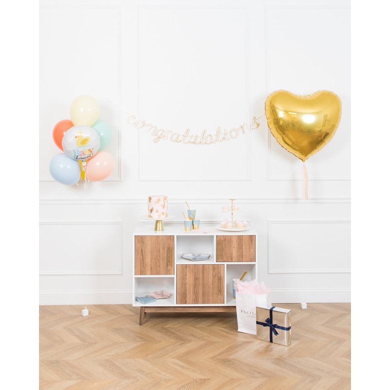 Create a beautiful celebration with this adorable baby shower set. This includes a heart balloon, a balloon bouquet and a congratulations banner. Use this around the room of any office space for an extra fun office or staff baby shower.