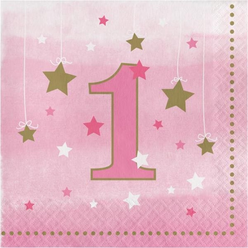 Make your Little Princesss First birthday memorable with One Little Star tableware and party supplies The package includes 16 pink with gold lunch napkins featuring number 1 and stars