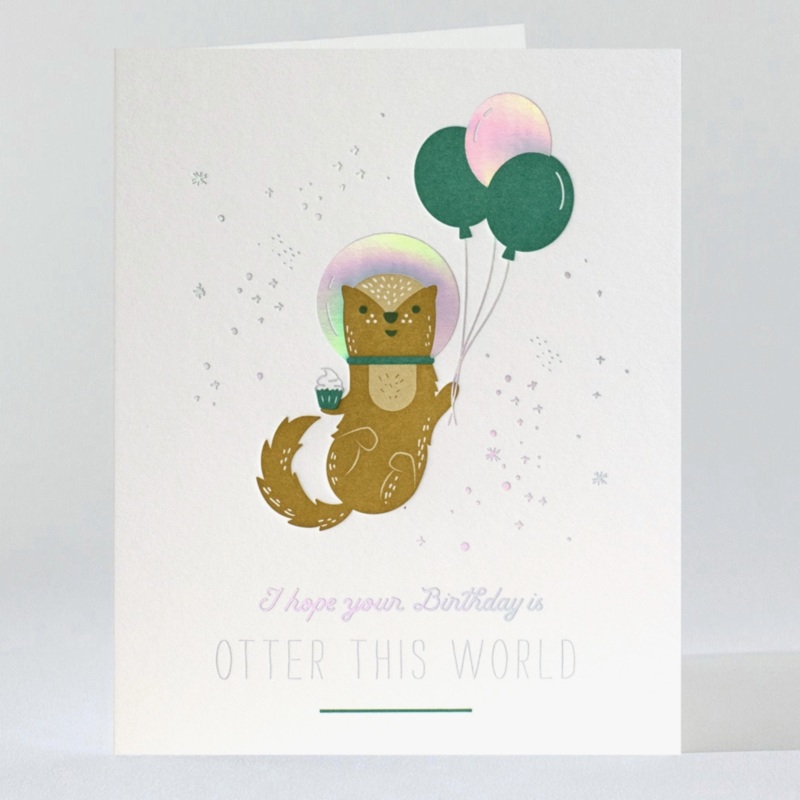 Featuring an adorable otter, this card is sure to bring a smile to anyones face. It's the perfect 'pawsative' way to wish someone well on their birthday!A2 size card (4.25" x 5.5")Holographic FoilLetter pressedInside Reads BlankIncludes matching envelope