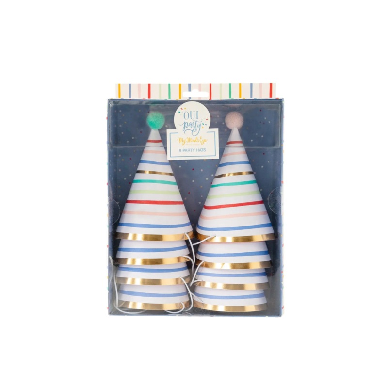 Get into the birthday spirit with these bright and cheerful party hats. From a little one's birthday bash to a grown up surprise party, your guest will be delighted to party in these whimsical hats. And with a dash of gold foil they add just the right amou