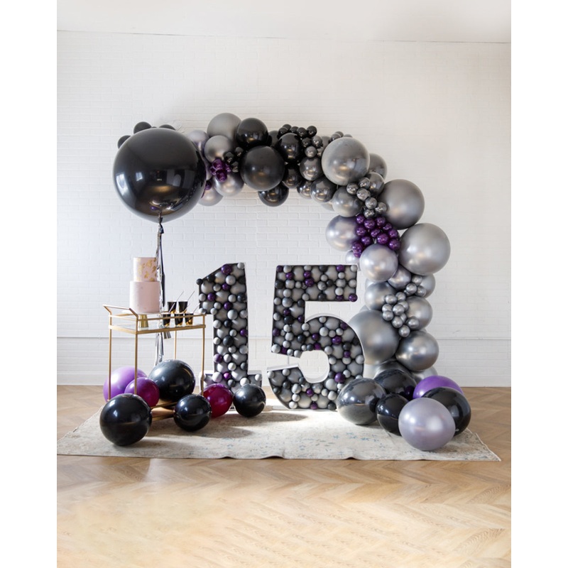 Set includes: balloon garland,giant balloon, number mosaic, floor balloons. This item includes install.Inflated with air – this item will not float.