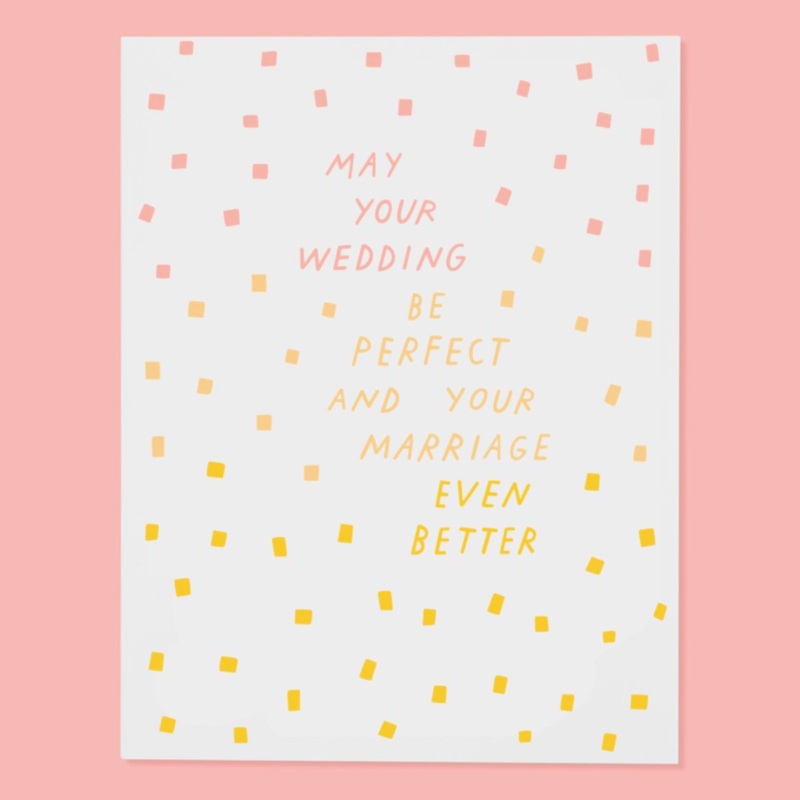 "May your wedding be perfect and your marriage even better"Send your well wishes to the new married couple with this beautiful card in fun pastel colors.Size A2, 4.25 by 5.5 inches foldedFour color screen print on French Paper