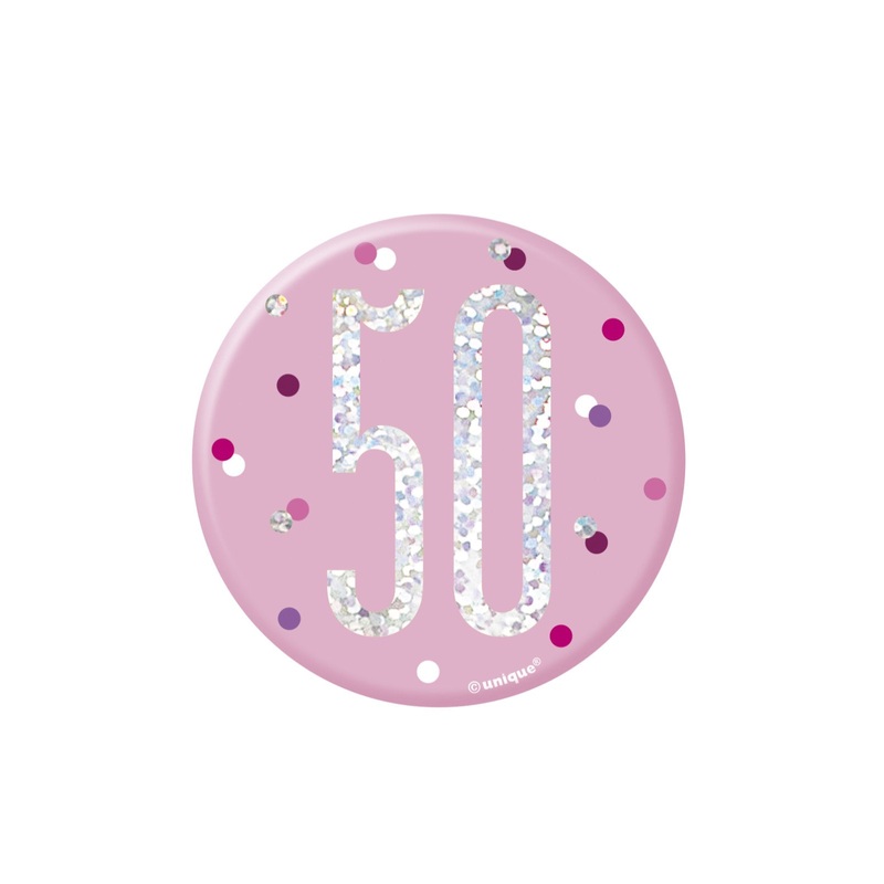 3 inch Pink Glitz 50th birthday pin badge.