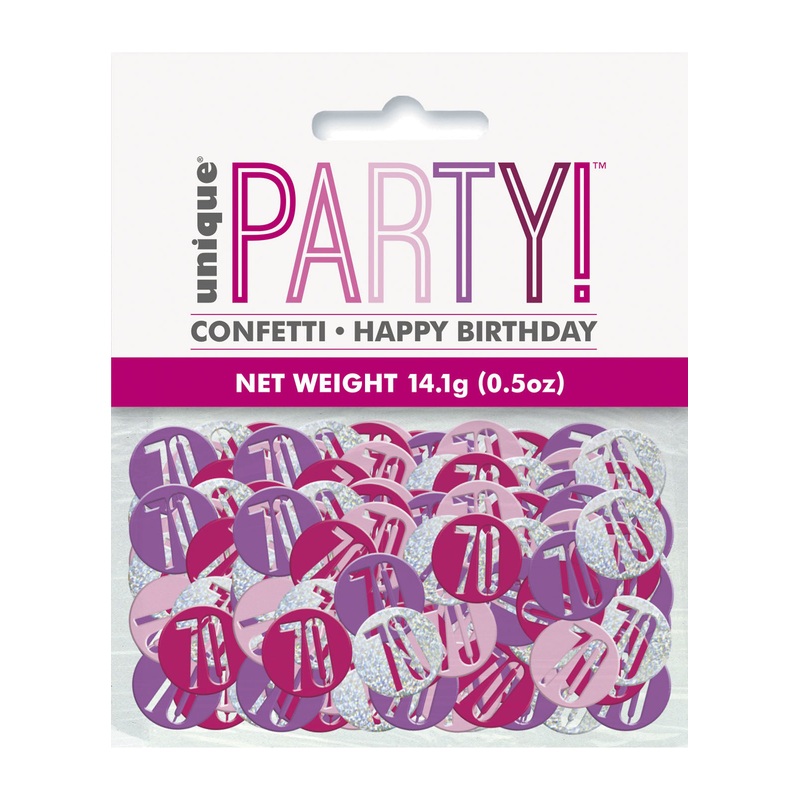 14.1g (0.5oz) pack of pink glitz 70th birthday party confetti.