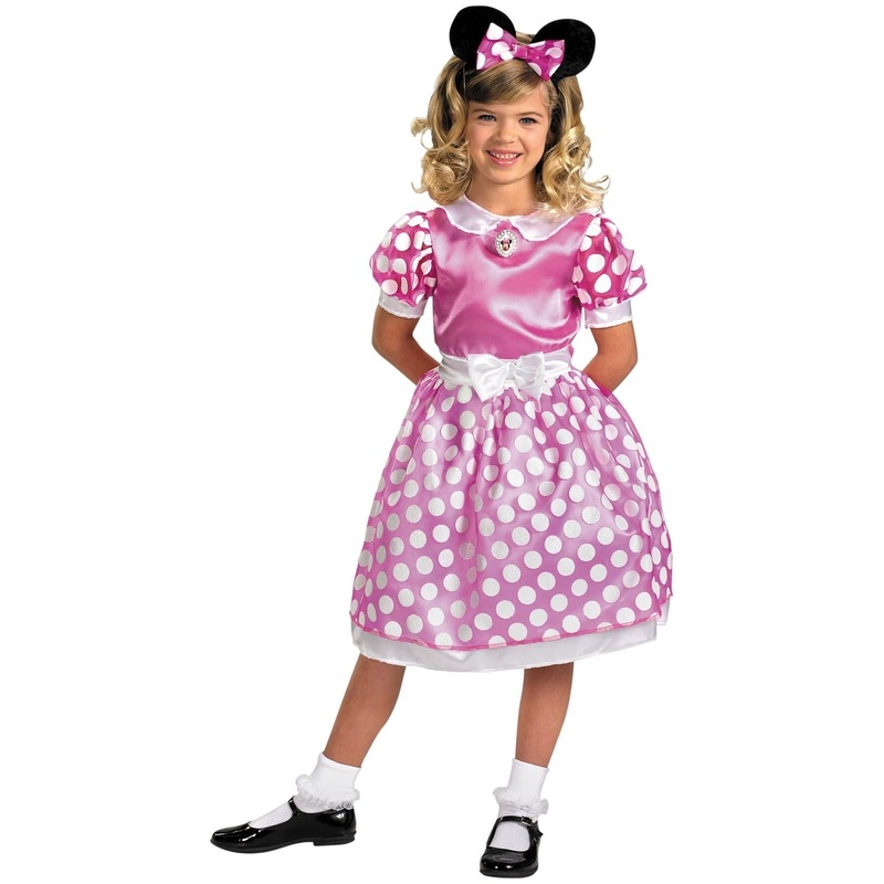 Clubhouse Pink Minnie Mouse Girls Costume includes pink polkadot dress with character cameo and headpiece.