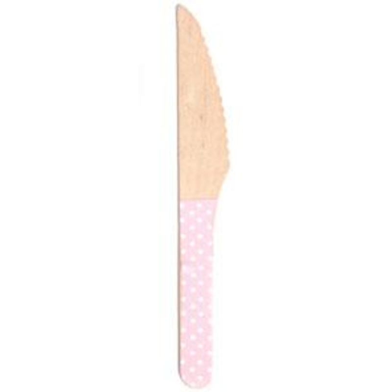 Premium eco-friendly pink polka dot wooden knives.A perfect addition to a birthday table, cocktail party, bbq, picnic or any special occasion.Made from biodegradable birch wood with stylish sticker design that won't peel or come off.Pack includes 24 knives