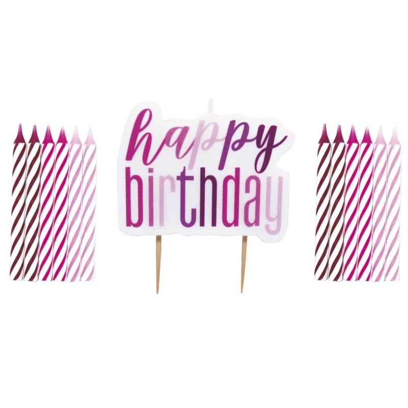 Pack of 12 Pink & Purple Spiral Candles and a Happy Birthday Candle.Celebrate in style with this pack of 12 Pink & Purple Spiral Candles and a Happy Birthday Candle. Perfect for any birthday cake, these vibrant candles add a pop of colour to your celebrati