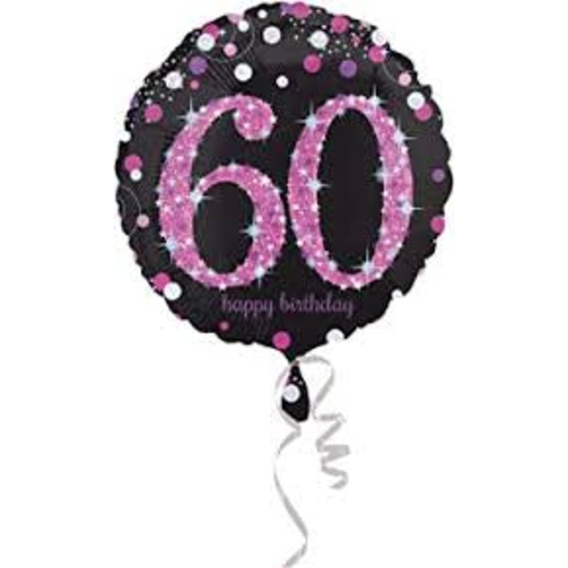 Featuring the number 60on a black background with sparkly pinkand silver prismatic accents, this balloon will add an elegant and personal touch to your milestone 60thbirthday party room – form it into a balloon bouquet for your table centrepieces, tie it to the guest of honour’s chair to make them feel special or float several along the ceiling of your party room for a sparkling 60thcelebration setting.