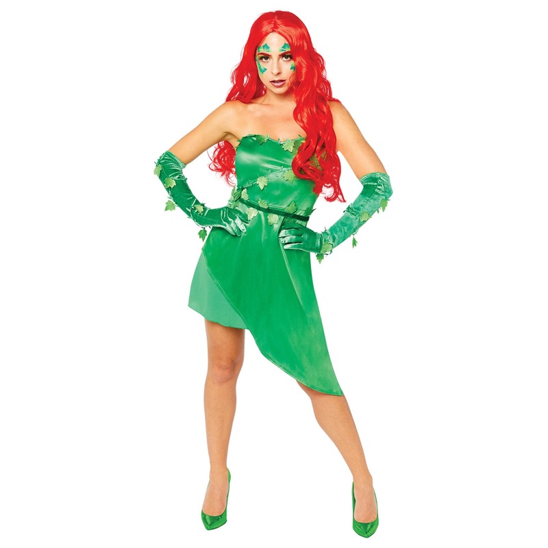 Licensed Poison Ivy fancy dress costume from the Batman series with green dress decorated with leaves, belt and long gloves.Pictured character wig available separately.