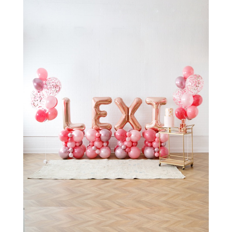 Celebrate them boldy with our name pedestal and confetti bouquet set! This includes two confetti bouquets and a custom name balloon pedestal in Pretty in Pink inspired shades. Use this as at your entry, sweets table or for photos at your teen’s birthday.