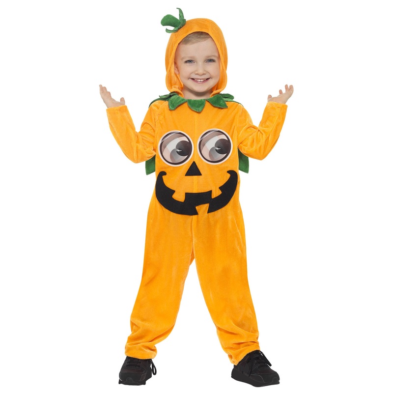 Pumpkin toddler fancy dress costume consisting of orange hooded jumpsuit with green trim and 3D printed eyes.SizeAgeChestWaistHeightSmall1-219 ''-20 ''19''-20''33''-35''Medium3-421 ''-22 ''21''-22''38''-46''Note: Measurements are manufacturer's guide.