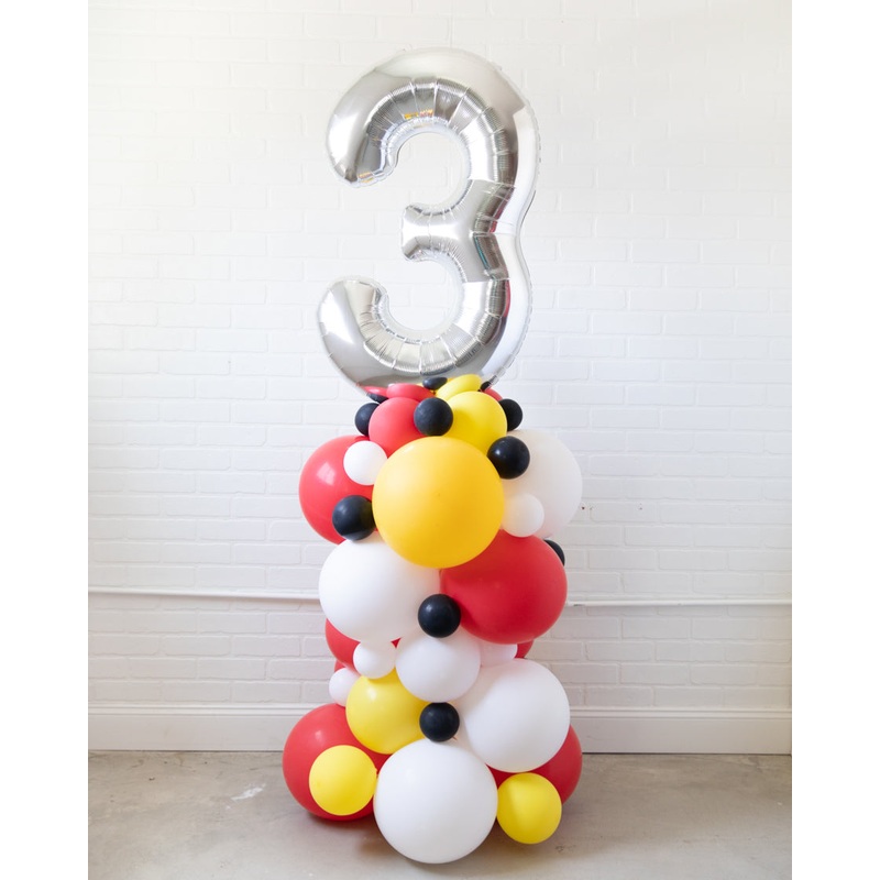 Our race car themed balloon column is an adorable addition to your race car themed boys birthday party! Created with air-filled balloons and topped with a silver foil number, this balloon arrangement is a picture perfect party.
