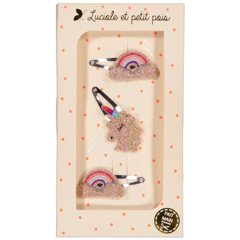 Dreaming of rainbows and unicorns! Trio features a glittery unicornand apair ofrainbow hair clips!