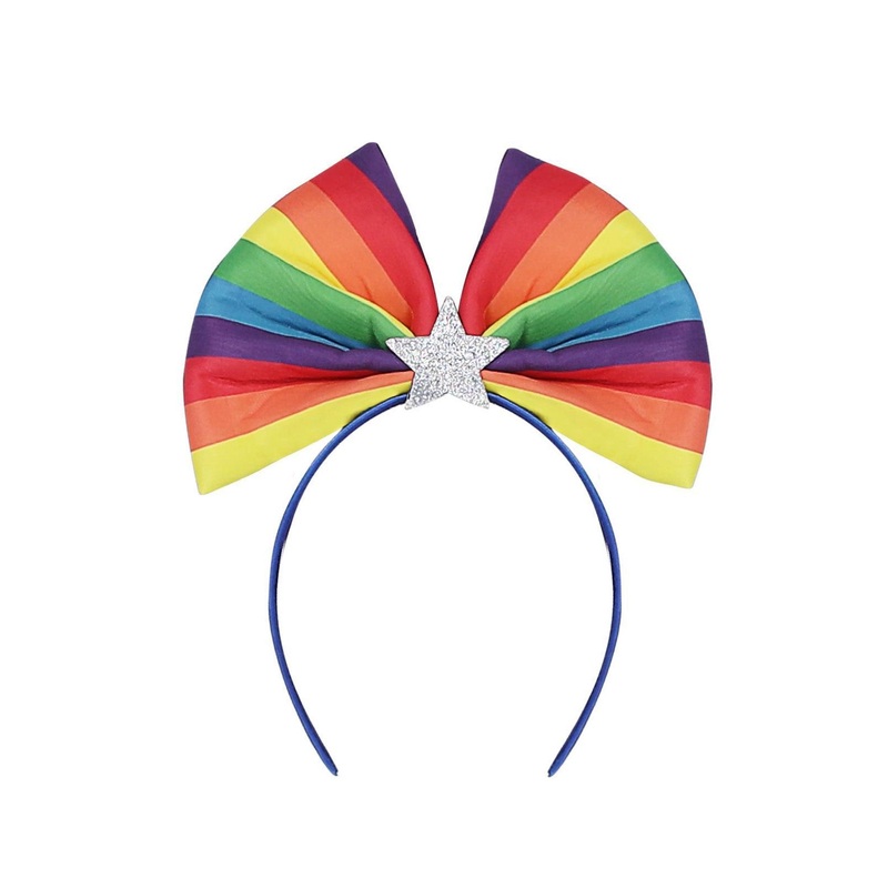 Pride rainbow flag bow with decorative silver star on a blue headband.