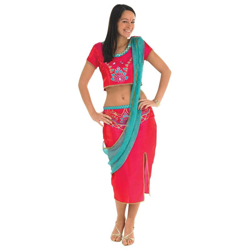 This cute and sexy Red Bollywood Starlet Costume includes a matching top and skirt set. The cropped top is detailed with gold and turquoise print as well as purple jewels. The matching skirt has similar detail to the waist and a split to one side. To creat