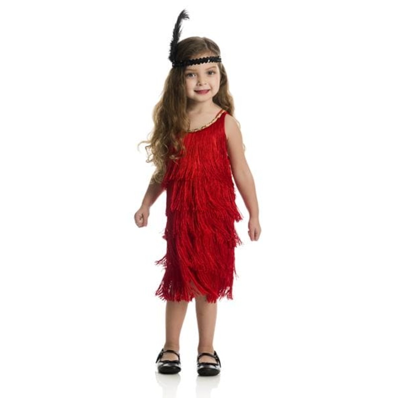 Your little girl can dress up in our Red Fashion Flapper Child Costume for all kinds of occasions such as Halloween theater masquerades and more that include a Roaring 1920s theme Our Red Fashion Flapper Child Costume features a red dress with a layered fringe and gold sequin trim.