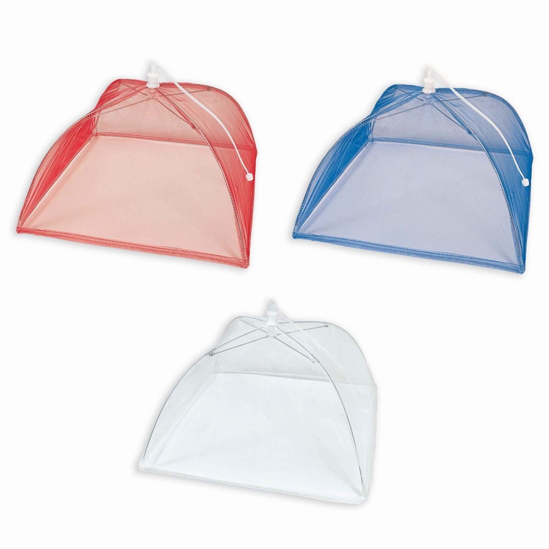 These food covers don't just keep your food safe and delicious, they also fit into your patriotic decorations with their red, white, and blue coloring! Each pack contains 3 food covers and each measure about 12in x 12in x 8in.