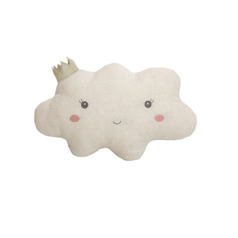 “Reine” is the French word for queen, and she is the queen ofthe clouds!Not only isthis the perfect place for a little one to lay his or her head, but its a nursery decorative pillow thanks to a convenient loop hanger on the back. Features a starry printed back!