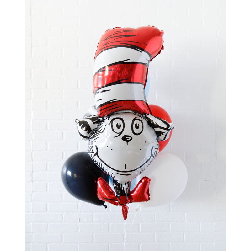 This fun bouquet with bright helium-filled balloons and a foil happy birthday Cat in the Hat balloon is great for a Dr.Seuss themed kids party. Place around the room or near a sweets table and photo backdrop for extra impact.