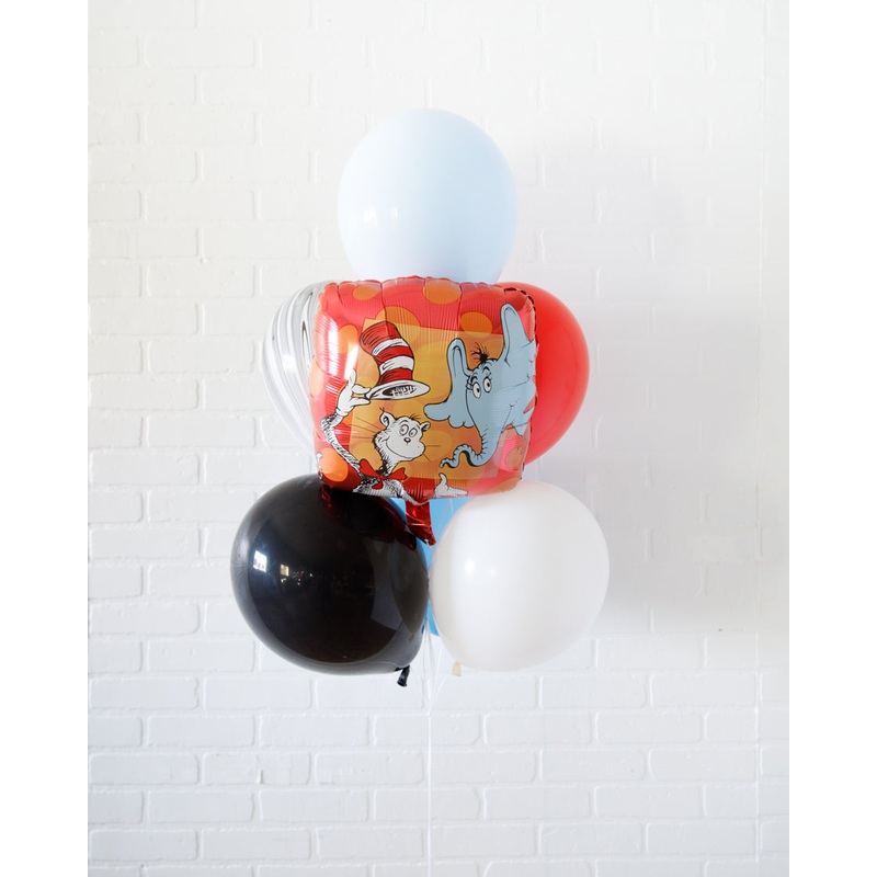 This fun bouquet with bright helium-filled balloons and a foil balloon is great for a Dr.Seuss themed kids party. Place around the room or near a sweets table and photo backdrop for extra impact.