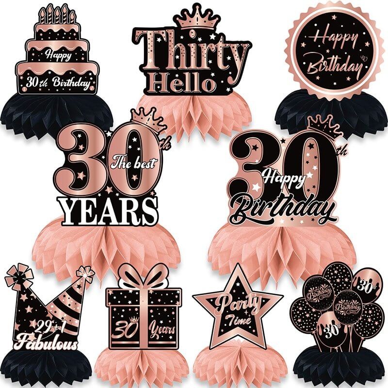 Pack of 9 Rose Gold 30th Birthday Honeycomb Table Centrepieces.Are you eagerly anticipating your 30th birthday celebration and want to make it a memorable one? Look no further than our exquisite Black Rose Gold 30th Birthday Honeycomb Table Centrepiece. Th