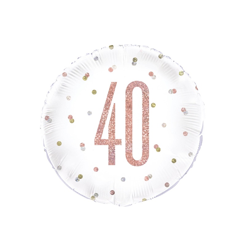 Rose Gold Glitz 40th Birthday 18" circle shaped helium balloon printed both sides. Click & Collect orders: Balloon supplied inflated with helium.Delivery orders: Balloon supplied deflated.Balloon comes with a plastic weight or choose a foil weight here. We