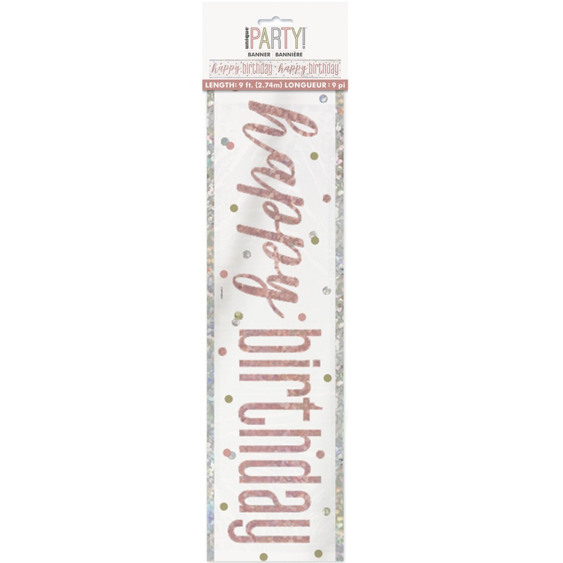 9ft / 2.74m long happybirthday rose gold Glitz banner printed one side.