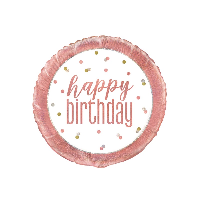Rose Gold Glitz Happy Birthday 18" circle shaped helium balloon printed both sides.Click & Collect orders: Balloon supplied inflated with helium.Delivery orders: Balloon supplied deflated.Balloon comes with a plastic weight or choose a foil weight here. We