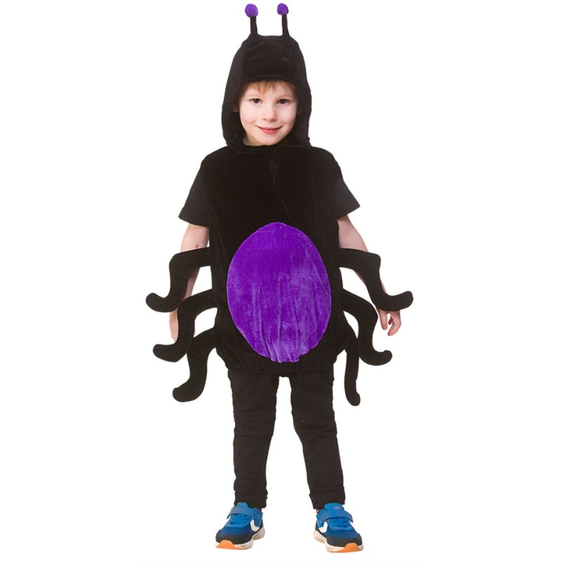 Black and purple child's spider fancy dress costume. Sizing: 3-5 years (Chest 74 cm, Length 44 cm (Shoulder - Hem)). Model is wearing own black trousers.
